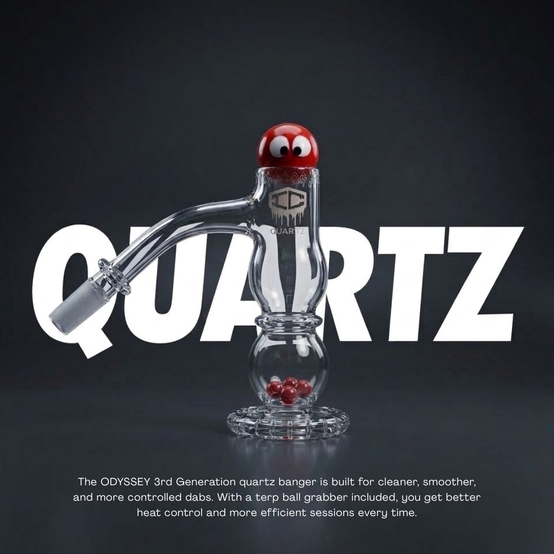 The IC Quartz Odyssey 3rd Generation Banger is designed for controlled heat distribution and smooth airflow. Includes a terp ball grabber for improved efficiency and ease of use.